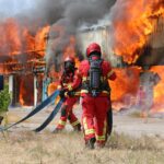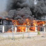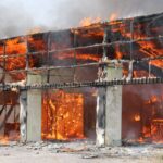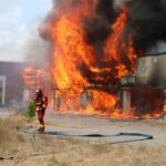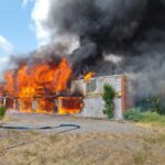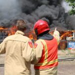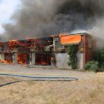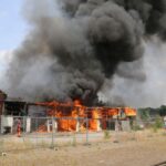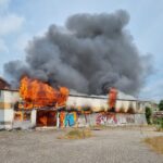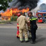 het pand is gedeeltelijk ingestort en staat volledig in brand. De brand geeft veel rook in het benedenwindse gebied rook is altijd schadelijke sluit ramen en wanneer mogelijk doe de ventilatie uit.