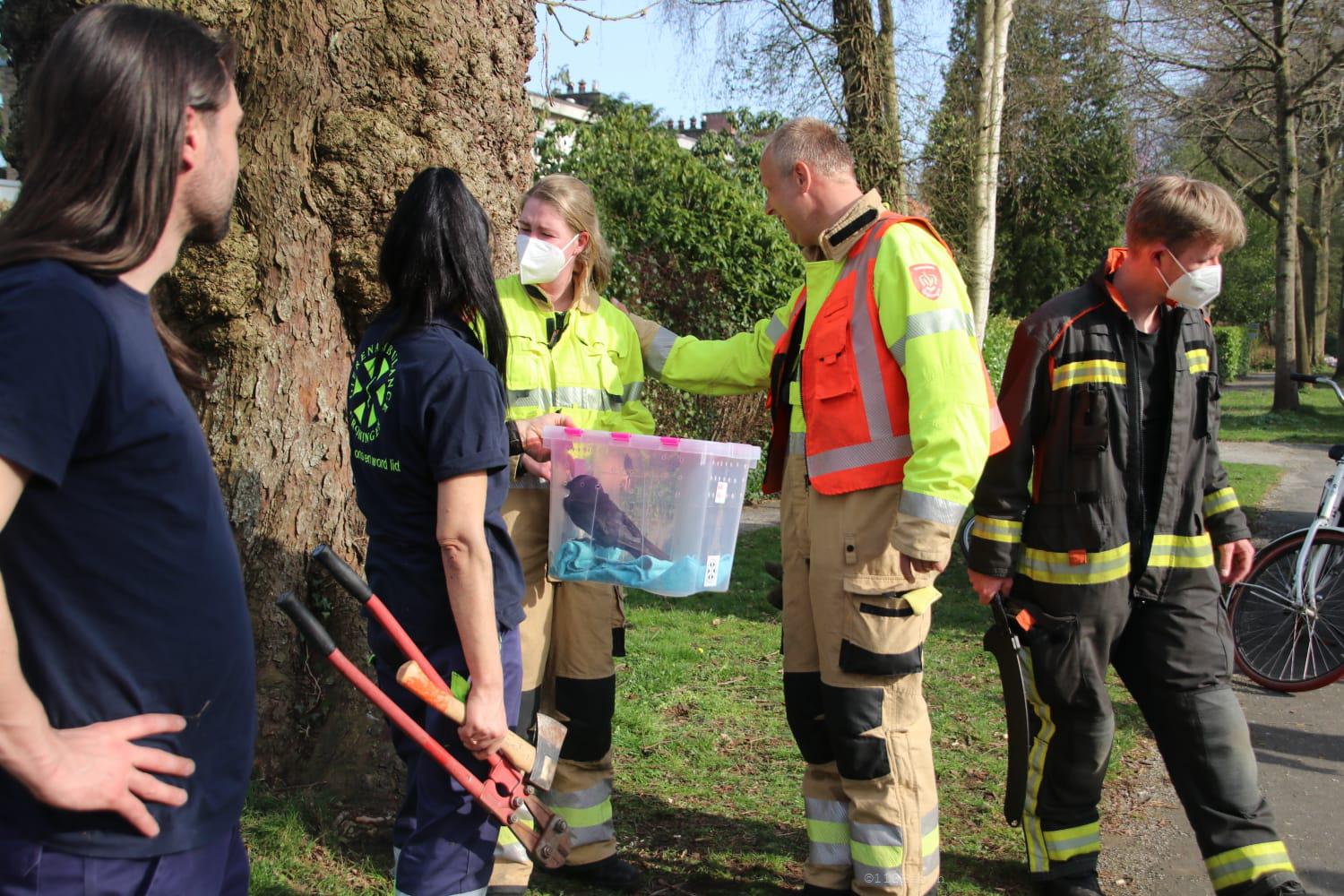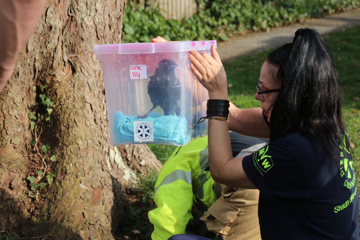 Hierna is de kraai overgedragen aan de dierenambulance die de kraai naar de opvang zal brengen. De reddingsactie trok veel bekijks van buurtbewoners.