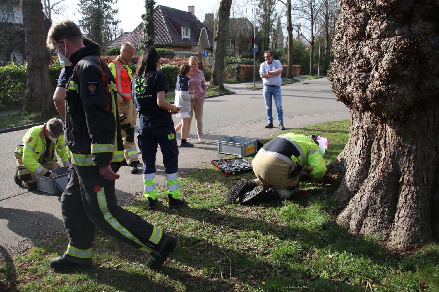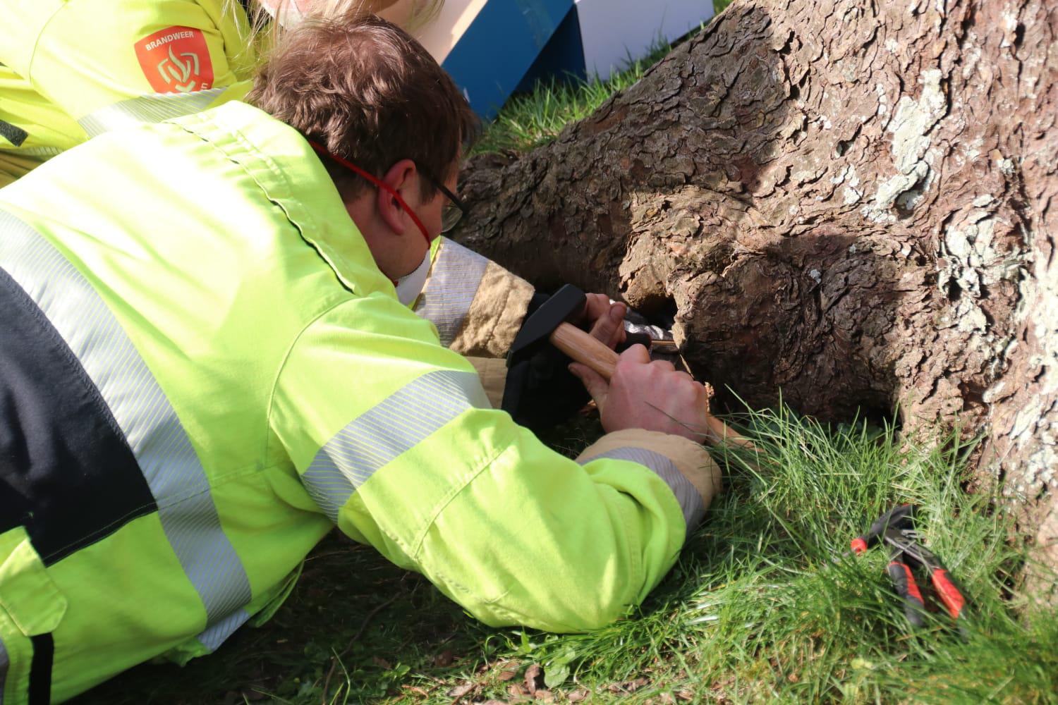 Haren – Een kraai is woensdagmiddag vast komen te zitten in een boomstam van een grote boom aan de Weg voor de Jagerskampen in Haren.