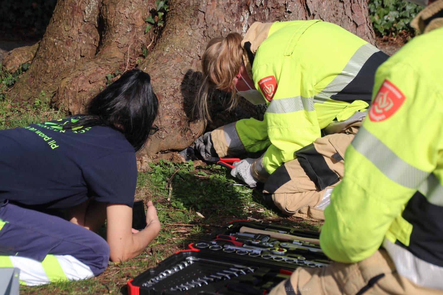 Een jongentje zag de kraai per toeval en alarmeerde de dierenambulance. Toen medewerkers van de dierenambulance het beestje niet los kregen, werd de hulp van brandweer Haren ingeroepen.