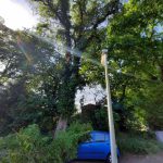 Door onbekende oorzaak knapte de grote tak van de stam af en belandde op een geparkeerde personenauto. Het gebeurde nabij de kruising met de Weg voor de Jagerskampen.