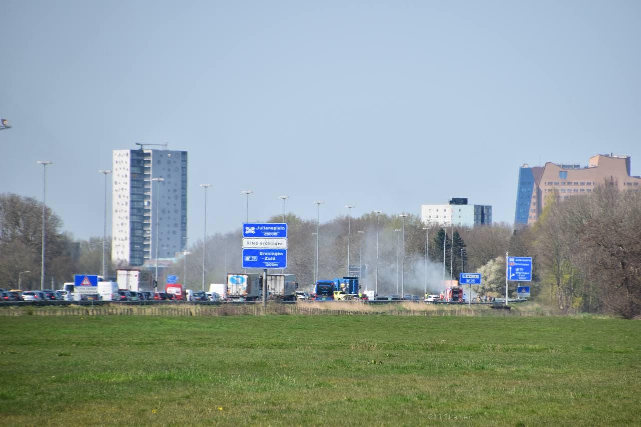 Brandweer Haren blustte de brand. Niemand raakte voor zover bekend gewond. Vanwege de brand zijn de opritten naar de A28 afgesloten. Een deel van de weg werd ook afgezet. Daardoor ontstond er een lange file. Berger poort zal de auto afslepen en Rijkswatesrtaat en de politie beveiligen het verkeer.