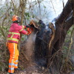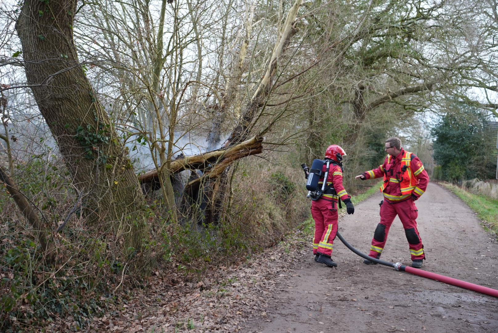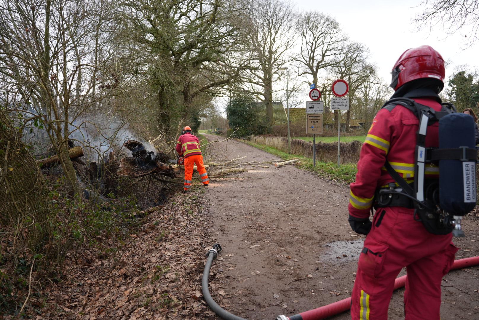 De brandweer heeft de brand snel geblust en de boom met een kettingzaag opengezaagd om te controleren of er geen smeulende resten achterbleven.