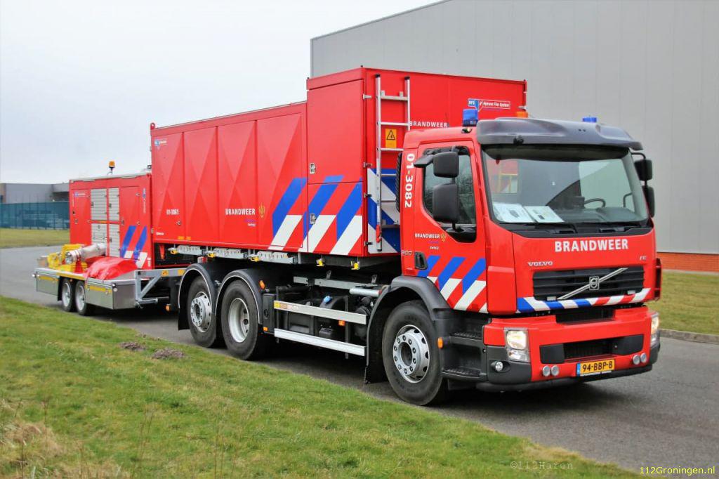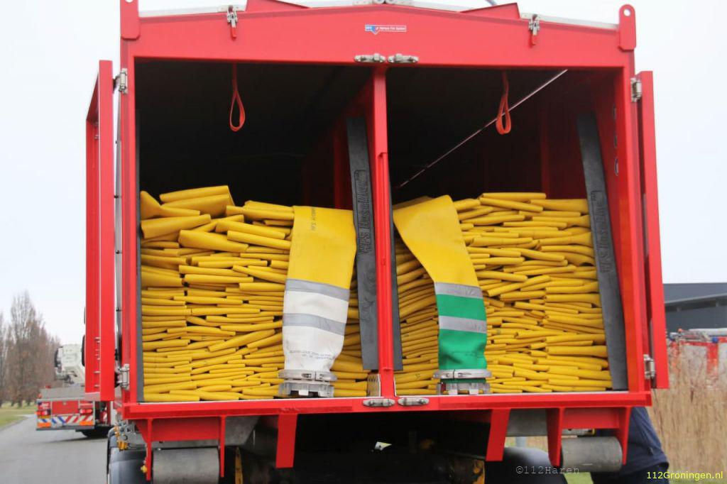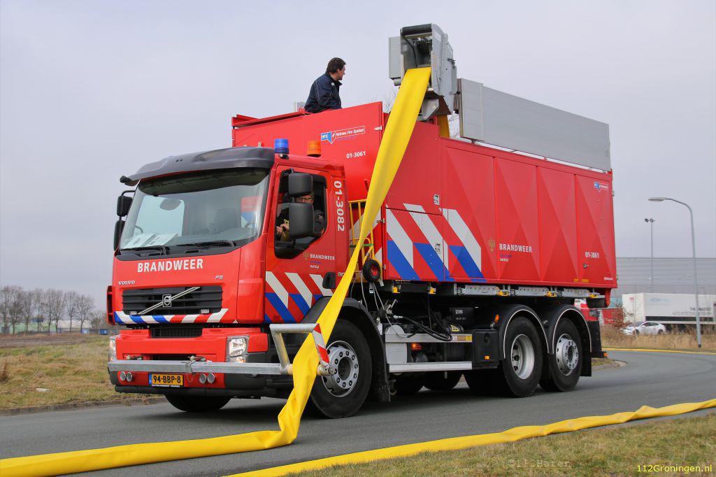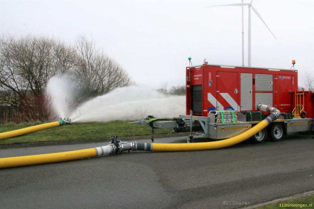 Veendam – Vrijdag en zaterdag kregen een aantal leden van de korpsen Veendam en Delfzijl een instructie over het nieuwe WTS 2.0 systeem, bestaand uit een haakarmbak met 3km 8’’ transportslangen en een dompelpomp op trailer. Een instructeur van de firma Hytrans , de leverancier van de grootwatertransport systemen, kwam naar Veendam om uitleg over het systeem te geven. Na een theorie gedeelte op vrijdag, werd er zaterdag in de praktijk geoefend. Dit vond plaats op industrieterrein Dallen II . Hier werd de volledige 3km slang uitgereden en vervolgens op druk gezet. De pomp gaf bij 10 bar aan het eind van de 3km nog een opbrengst van +/- 6000 lpm. Direct bij de pomp zou de opbrengst +/- 13.000 lpm kunnen zijn.