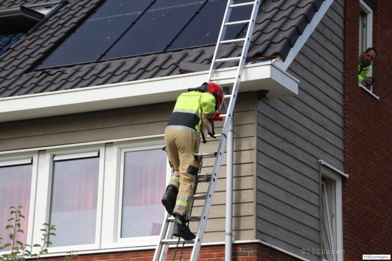 Een kat was via het dakraam op het dak geklommen en was in de dakgoot belandt. Het dier kon niet meer zelfstandig naar binnen komen waarop de hulp van de brandweer werd ingeschakeld. Brandweerlieden wisten met een ladder omhoog te klimmen om het katje, die inmiddels onder de dakpannen was geklommen, te redden. Het katje was binnen vijf minuten weer veilig aan de grond en raakte niet gewond. Hoelang het katje al op het dak zat is niet bekend. Eerder vanmorgen moest de brandweer ook al uitrukken voor hetzelfde katje, maar toen kon hij niet worden gevangen.