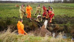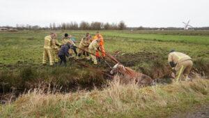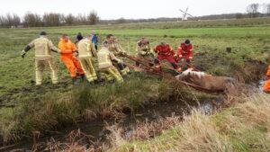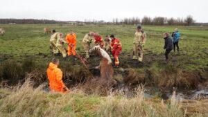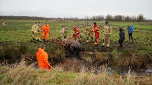 Later werd ook de HV opgeroepen, deze werd niet ingezet vanwege de drassige natte bodem. Met vereende krachten werd het paard eruit getrokken op de ouderwetse manier. Het dier wordt gecontroleerd door een vee-arts.