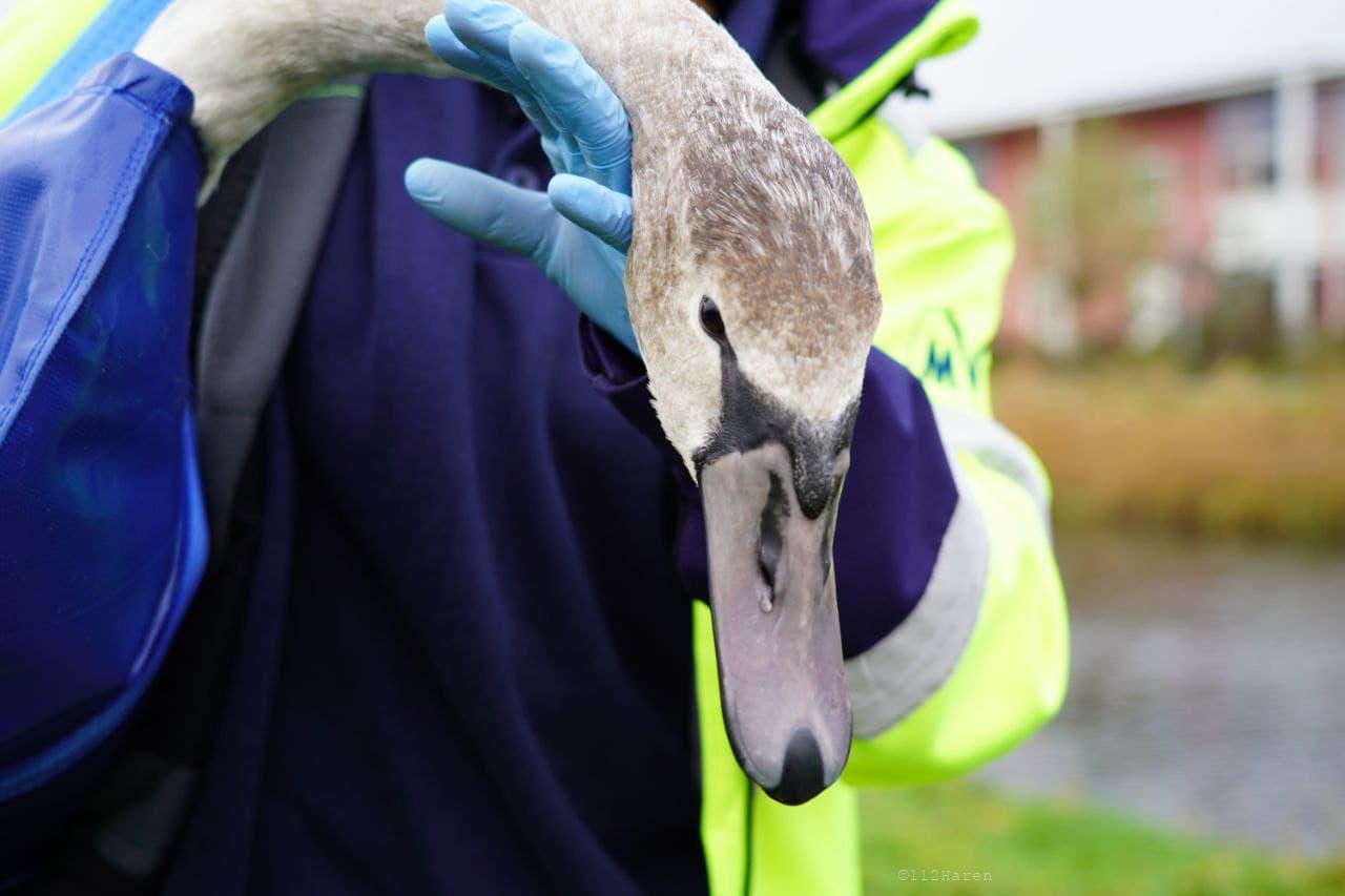 De zwaan was buurtbewoners al eerder opgevallen, omdat het dier een stuk visdraad om zijn poot had en dat was toen verwijderd. In de afgelopen vijf weken zorgde dit visdraad ervoor dat één van de poten van de zwaan ontstoken raakte. Het dier liep daardoor moeilijk zegt Oogtv.nl. In samenwerking met de Stichting vogelasiel “De Fûgelhelling” in Ureterp werd daarom besloten dat het dier behandeld moest worden. De dierenambulance bracht de zwaan, na de reddingsactie, dan ook meteen naar het Friese dorp overgebracht. Brandweer redt mens en dier in nood !