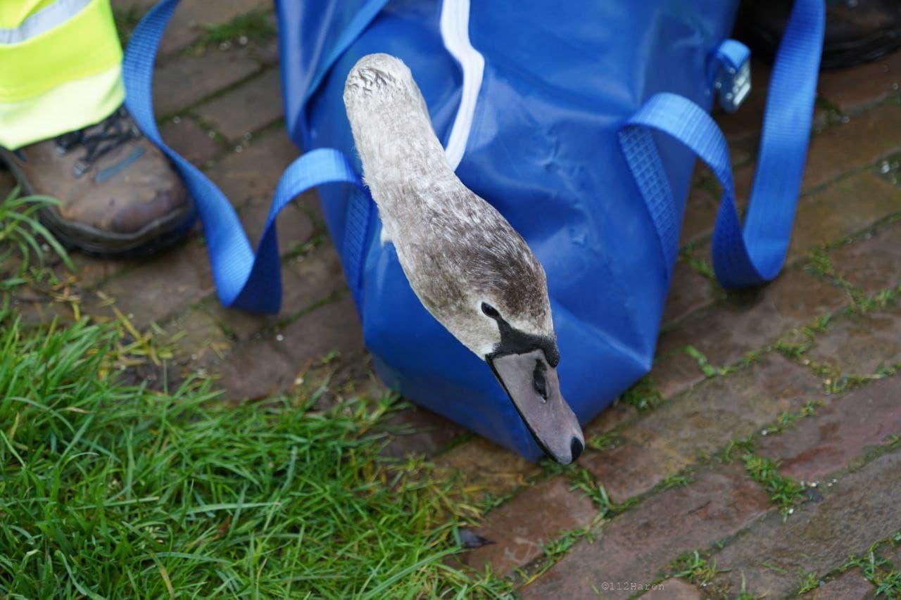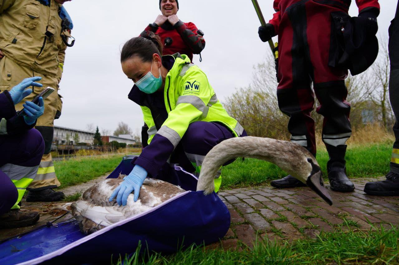 Groningen – Duikers van de brandweer stad zijn vrijdagmorgen om 10:30 uur het water ingegaan bij het Zonland in Lewenborg om een gewonde, jonge knobbelzwaan te vangen. Het dier had een ontsteking aan één van zijn poten opgelopen. De brandweerduikers wisten het dier klem te zetten. Daarop werd de vogel met een soortement van lasso gevangen en naar de waterkant gedragen. Daar ontfermden medewerkers van de dierenambulance zich over de jonge zwaan.