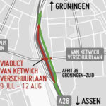 Groningen – Vanwege werkzaamheden aan de A28 is de Van Ketwich Verschuurlaan onder de A28 van zondag 9 juli 22.00 uur tot zaterdag 12 augustus 06.00 uur afgesloten voor alle verkeer. Ook voetgangers en fietsers kunnen niet onder het viaduct van de A28 door.