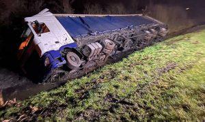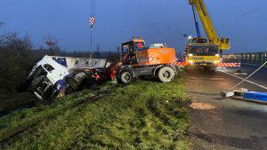 Leek – De A7 tussen Industrieterrein Westpoort en Leek in de richting van Heerenveen is afgesloten. Poort is bezig met het bergen van de gekantelde vrachtwagen. Het is een forse klus. De vrachtwagen met kippen is woensdagnacht rond 01:45 uur bij Leek van de weg geraakt. De brandweer werd ook opgeroepen. De oorzaak is niet bekend. Voor zover bekend raakte niemand gewond.